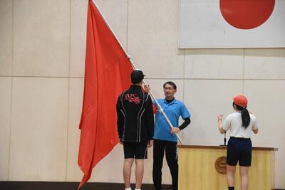 始めに小学校の校長先生から、小中学校団長に団旗の授与が行われました。