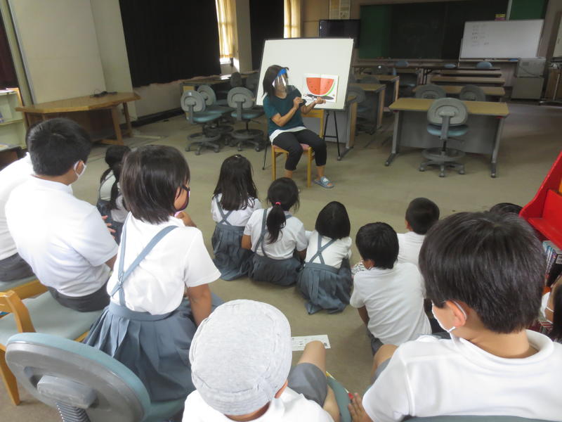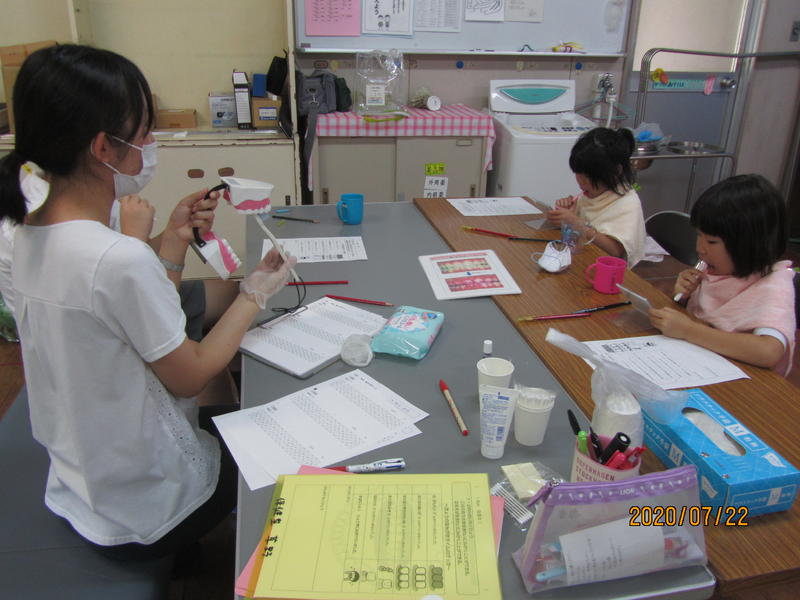 昼休みに、保健室の先生による歯磨き指導が行われています