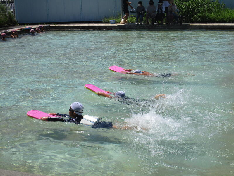 低学年、中高学年に分かれて、けのびをしたりクロールをしたり、赤白対抗リレーをしたりしました。