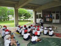 1・2年生は、教室でお話を聞いた後、運動場に出て、実際に左右を確認したり、手を挙げたりして横断する練習をしました。また、雨が降っている場合の安全な横断の仕方も練習しました。傘をたたんでいるときも、安全に持ち運ぶことも学び、さっそく実践している子どもたちでした。これからの登下校の歩行に生かして、安全に心がけていけると良いですね。