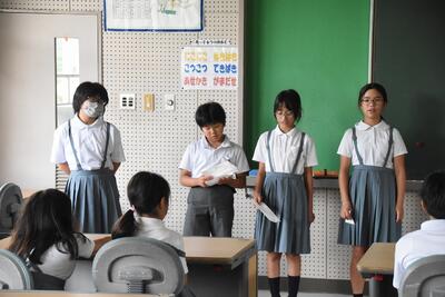 7月4日の朝、各学級で話し合った、人権目標を発表する、