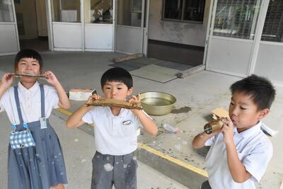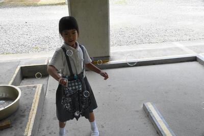 7月16日 1年生が生活科で、水鉄砲遊びとシャボン玉遊びをしました。