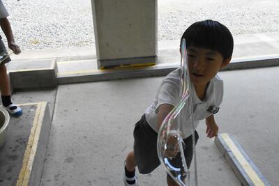 ハンガーで大きなシャボン玉ができると、子どもたちは大喜び。