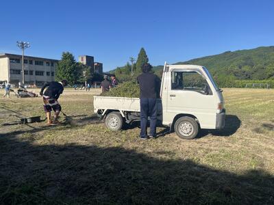 朝早くから、多くの保護者や地域の方々にお手伝いいただき、運動場周辺の除草作業を行いました。