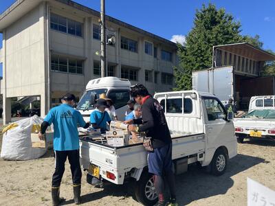 保護者の皆様が集めてくださった、アルミ缶や新聞紙などを、中学生と職員で積み込みました。