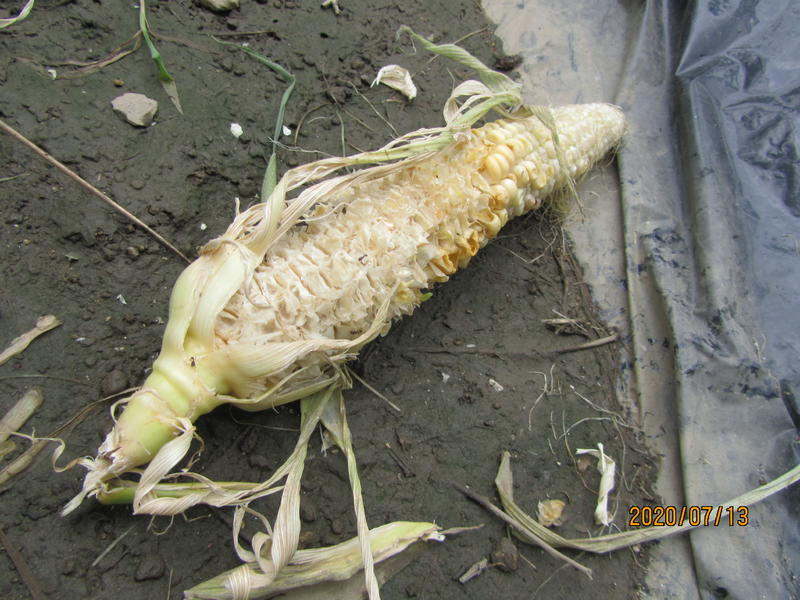 児童が大事に育てていたトウモロコシが、片っ端から折られて食べ散らかされていました。