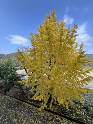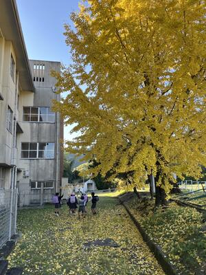 銀杏の葉を「落ち葉のシャワー」にしてお祝いしていました。