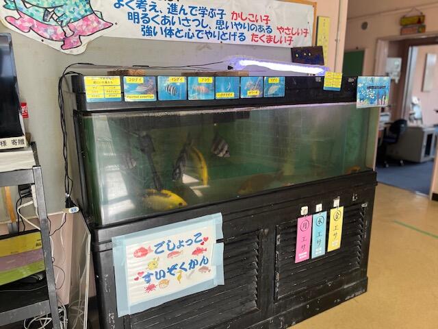 朝から子どもたちに囲まれる「ごしょっこ水族館」。今日も「わあ、きれいになってる!」と声をあげながら、1・2年生の子どもたちが水槽をのぞき込んでいました。昨日の放課後、保護者の方が掃除と海水の入れ替えをしてくださったおかげです。水槽の中では、鯛の稚魚がすくすくと成長しています。