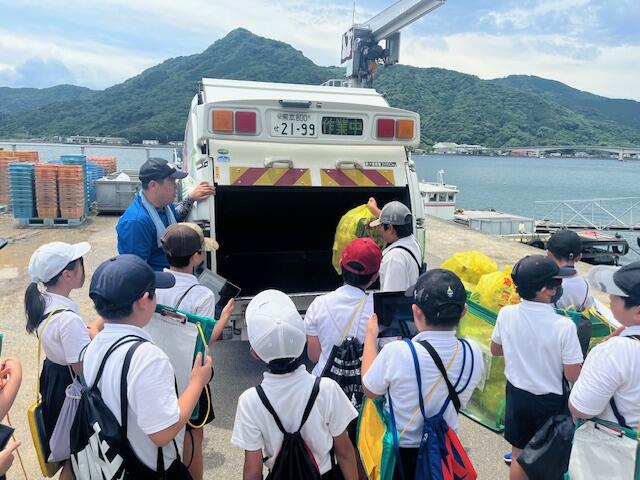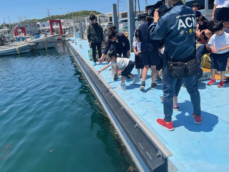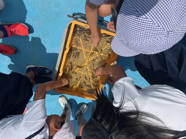昼休みには、ヒラメの稚魚放流体験をしました。御所浦漁協の方のご厚意で貴重な体験ができる子どもたちは幸せです。児童の手のひらより小さな魚が懸命に泳ぎながら、海の底へと潜っていきます。その様子を見つめる子どもたち、どんなことを考えながら放流したんでしょうね。
