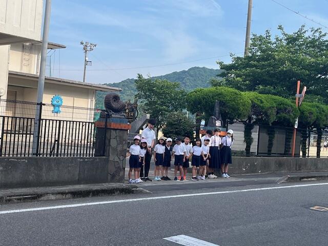 昨日は1年生でした。黄色い帽子が並んでいるだけでも笑顔になります。いつもお世話になっている御所浦タクシーさんにも元気なあいさつを届けました。