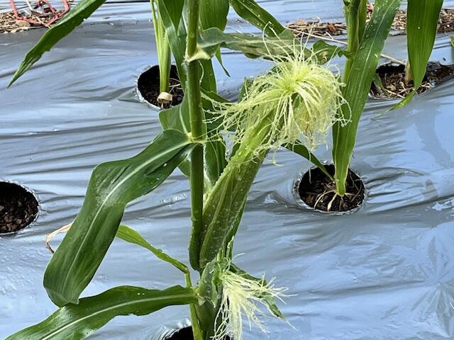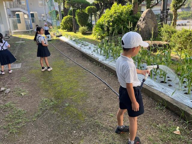 朝から、帽子をかぶってバケツとひしゃくをもっている児童が・・・。「どこ行くの?」と声をかけると、「水やりにいくんです!」とのこと。一緒について行くと、すくすくと育っているトウモロコシやミニトマトに水やりを始めました。「トウモロコシの赤ちゃんができているんですよ。」と、近くにいた1年生が嬉しそうに伝えてくれます。(その1年生は、数人並んでアサガオに水やりをしていたところでした。)・・・朝からすがすがしい気分になりました。