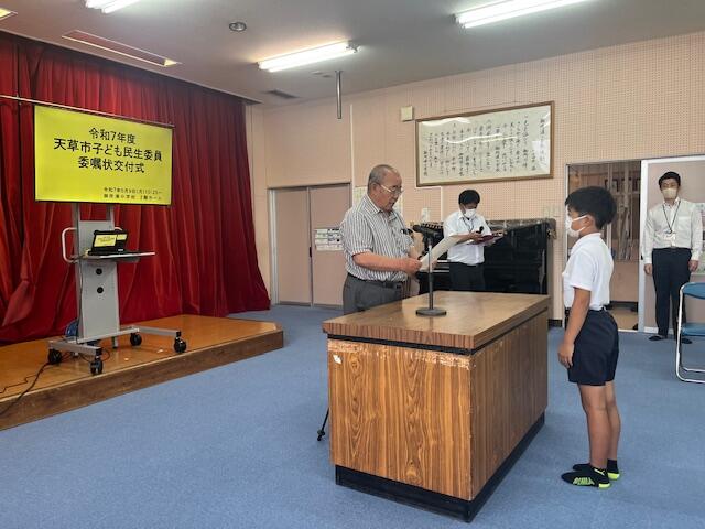 3時間目には、4年生が「天草市子ども民生委員 委嘱状交付式」に参加しました。多くの民生委員の皆様に見守られ、脇島会長から委嘱状を受け取った子どもたちは、民生委員としての活動をスタートさせました。その後、認知症サポーター養成講座を受けた4年生、気持ちが引き締まったことと思います。