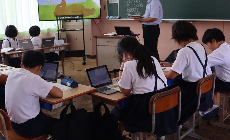 今日は、天草市教育委員会の先生、御所浦中学校の先生、東京からの学生さん(キャラバン隊)が来校されました。2時間目の5年生の国語の授業では、タブレット端末に自分の考えを残しながら、話し合いが行われました。児童は、緊張しながらも話し合いが少しずつ活発になっていく姿が見られました。緊張の中での授業、これも大切な経験です。