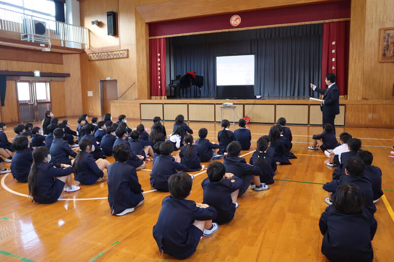 人権集会を行いました。人権主任の先生方からは、「自分のよいところに目を向けてみよう」というお話がありました。その後、縦割り班に分かれ、子どもたちは、友達のよいところをハート型の台紙に書き込んでいたものを手に紹介しました。誰のことが書かれているのか分からない班の友達は、発表を聞きながらドキドキしています。名前が明らかになると、紹介された子は嬉しそうに言葉を交わし、温かな雰囲気が広がりました。子どもたちが体育館を後にしたあとも、会場にはいつもより柔らかく、温かい空気が残っていました。