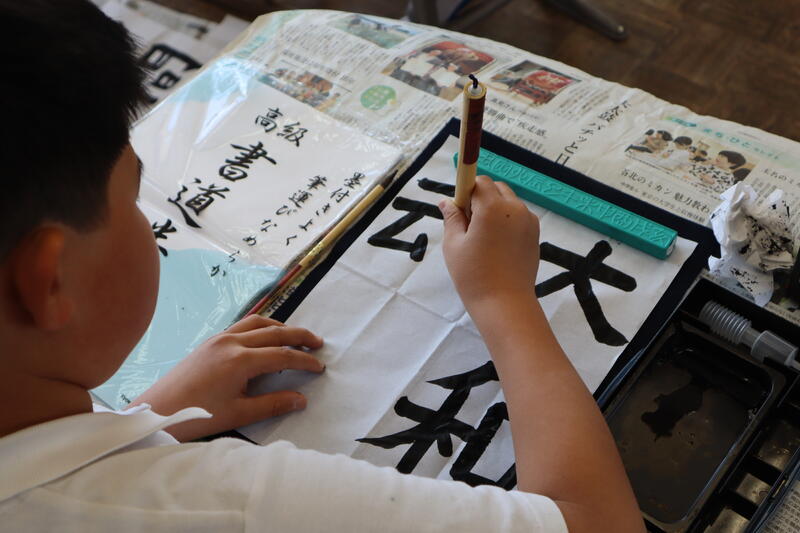 静寂に包まれた4年生の教室では、1年間の目標など、それぞれが選んだテーマで書き初めに向き合っていました。教室に足を踏み入れると、子どもたちの真剣なまなざしが並んでいます。一画一画に思いを込めて筆を運ぶ姿からは、集中した空気がひしひしと伝わってきました。きっと、心から満足できる一枚が仕上がったことでしょう。