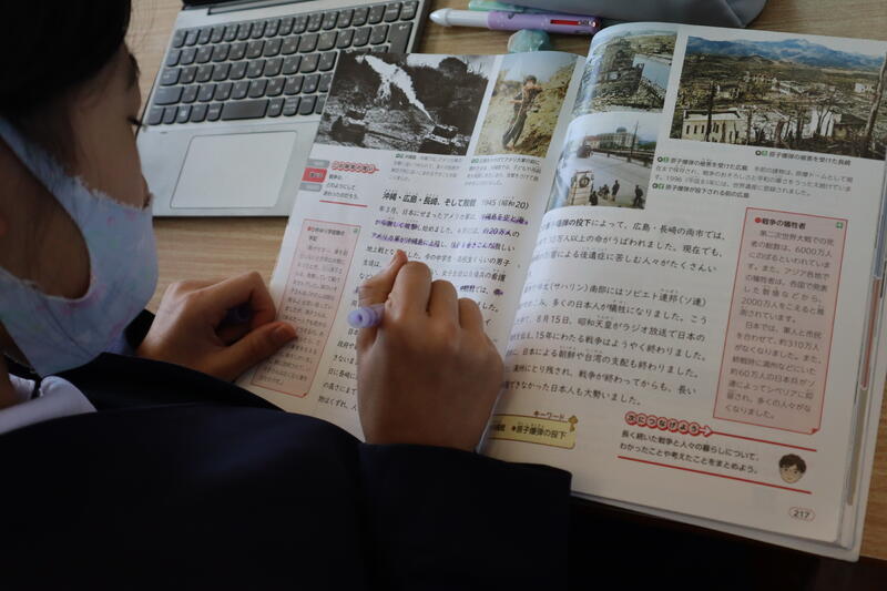 課題解決に向けて、教科書の情報をしっかりと読み解いていきます。ポイントにはアンダーラインを引いたり、写真と文を結びつけたりしながら、必要な情報を収集し、タブレット端末に自分の考えを入力していきます。