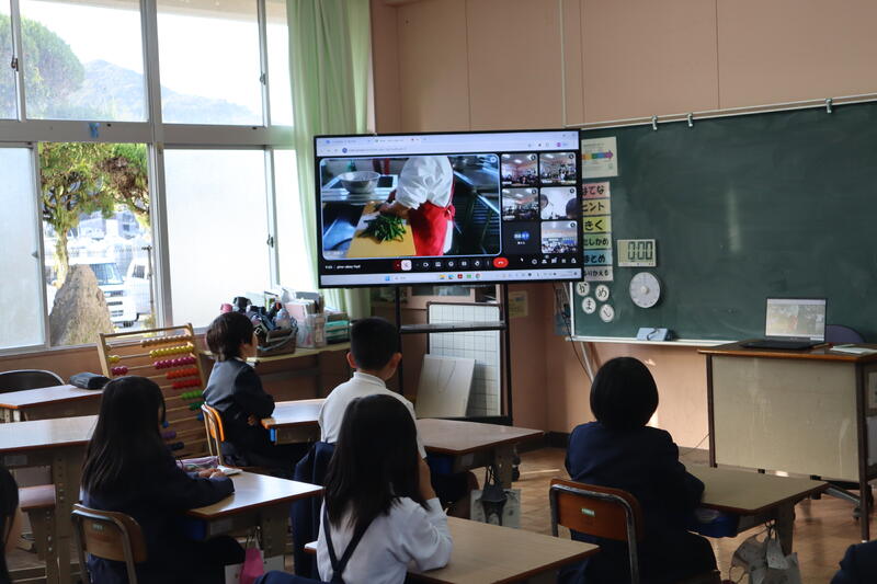 今日の給食集会では、小学校の教室と御所浦給食センターをオンラインでつなぎ、子どもたちが普段見ることのできない「給食ができるまで」を紹介するライブ中継が行われました。画面の向こうには、白衣と帽子に身を包んだ調理員さんたちが、慌ただしくも丁寧に作業を進められる姿が映し出され、子どもたちは興味津々で見入っていました。(下の写真は2年生の様子です。集中しています。)
