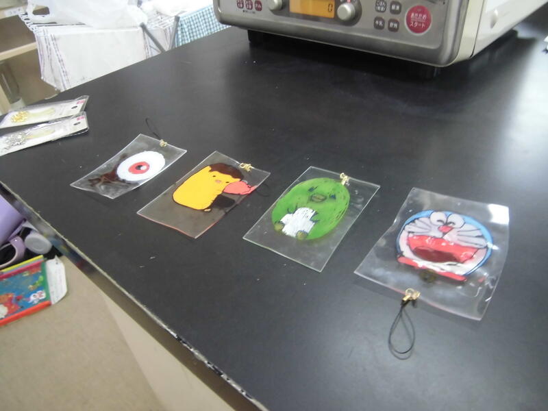 3年生が作ったプラ板は家庭科室にきれいに並べられており、どれもかわいらしい作品に仕上がっていました。