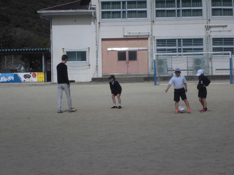 運動場では、ALTのセオ先生と一緒にサッカーを始めようとしていました。これは、2年生のようですね。最初は少なかったのですが、あとから大勢でサッカーを楽しんでいました。朝からは、毎日のように4年生がサッカーを楽しんでします。
