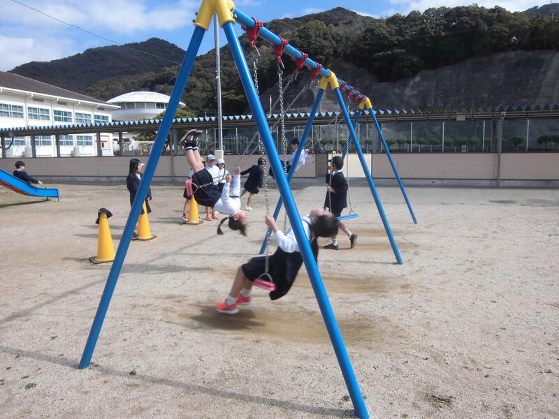 ブランコで遊んでいるのは、3年生。「そんなに振って大丈夫?」というぐらいの勢いです。そのまま、空へと飛んでいってしまいそうでした。