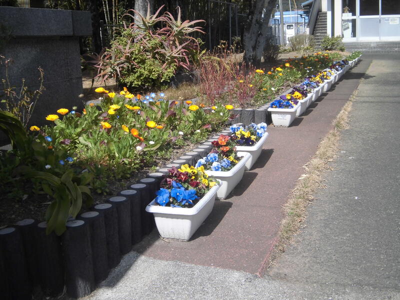 正門の方へ歩いていくと、パンジー、ビオラ、ノースポールなど、プランターに植えられた花が大変きれいでした。いつもきれいに整えてくれている職員、子どもたちに感謝です。
