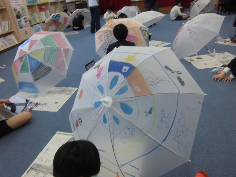 今日は、アンブレラアートです。図柄のない半透明の傘に思い思いのデザインをしていきます。