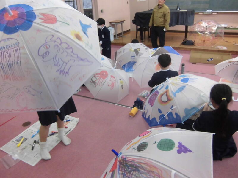 3・4年生のみんながデザイナーになりきって、世界に一つだけの特傘を作りました。「校長先生、見てください!」と嬉しそうに傘を広げて見せてくれる児童もいて、心が温かくなりました。アニメのキャラクターやおいしそうな果物など、どれも個性が光るオリジナル作品ばかりです。