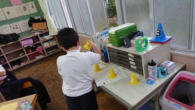 ③子どもたちはプリントファイル、色塗りシート、先生シール用シートを用意します。