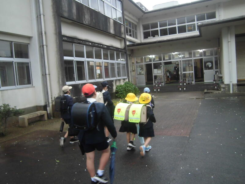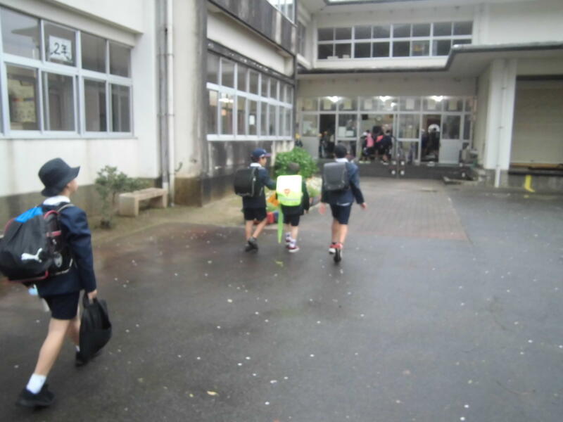 1年生は6年生と一緒に避難します。しかし、雨が強くなってきたため、途中で学校へ戻りました。健康安全を最優先に判断したものです。来週の月曜日の朝タイムに、改めて避難訓練を実施します。