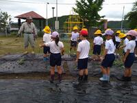 1年生は生活農園で、スイカの観察です。すいかもどんどん船長しています。今年も大きなスイカがたくさん実ればいいなあ。昨年はカラスなどに狙われないように、覆いもつくっての大収穫でした。