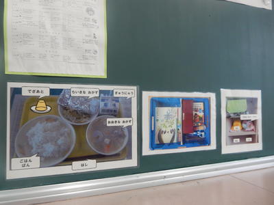 カバンだなや引き出しの中、給食配膳の並べ方・・・、これがあることで子どもたちは視覚的に理解を進めることができます・・・、ユニバーサルデザインです・・・。
