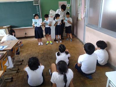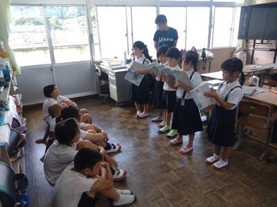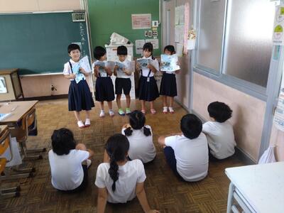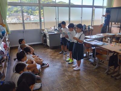 さて、今日はまず昨日の1年生による「やくそく」音読発表会の様子から紹介します。