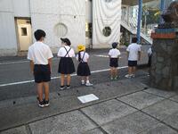 学校では、あいさつ運動で、子どもたちが道行く車に挨拶です。