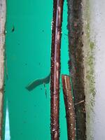 さて、今日は珍しい魚を発見しました。海を眺めているとすぐ下に80cmぐらいの黒いゆらゆらした生き物がぷかーっと浮かんできました。よく見ると「ウナギ????」ではないかなと思います。