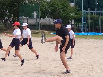 さて、今日は御所浦中学校の体育の松原先生をお招きし、陸上教室です。