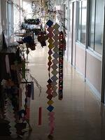 七夕飾りです。学年に分かれて飾りや短冊を結びつけていきます。