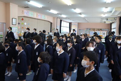 今日終業式の中で、3学期に頑張ってほしいことを伝えました。それは『「自分で」「自分から」を意識して』ということです。特に、生活面では、「自分から挨拶」を大切にしてほしいと思います。」