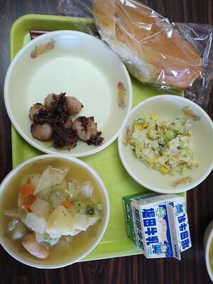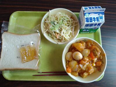 さあ、今日の給食は「ウズラの卵とジャガイモのケチャップ煮」「リンゴジャム 食パン」「スパゲッティサラダ」でした。美味しく頂きました。みんなにウズラの卵は何個ずつだったのかな?気になってしまいました。