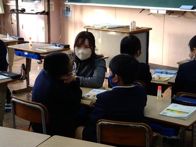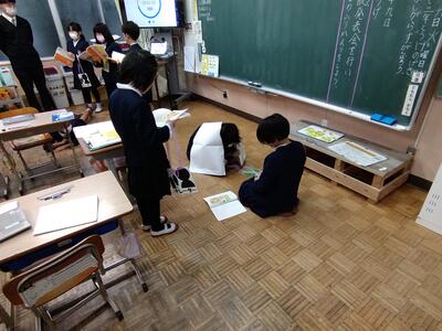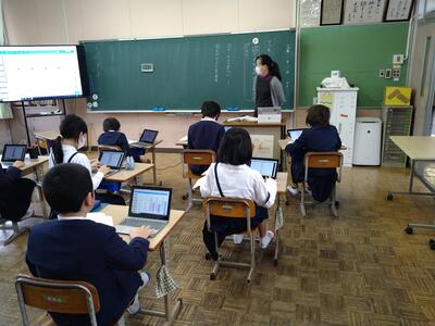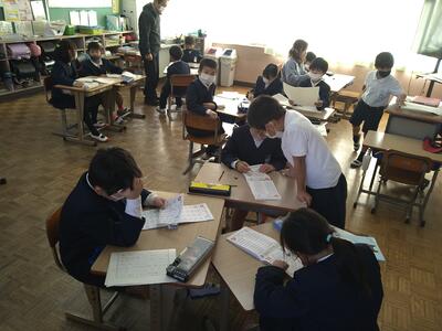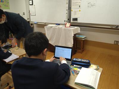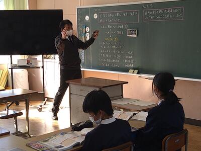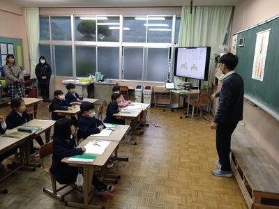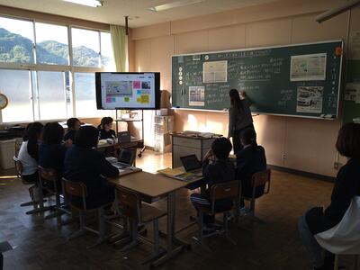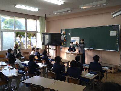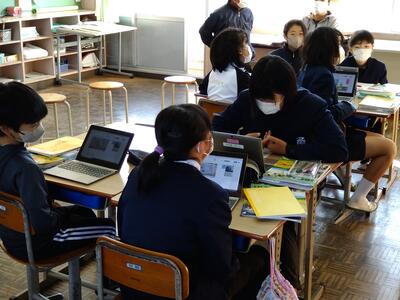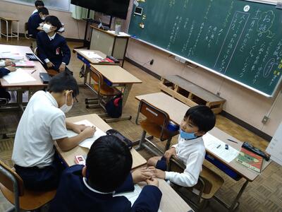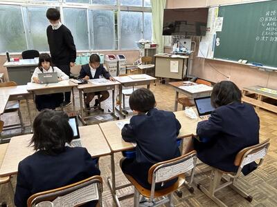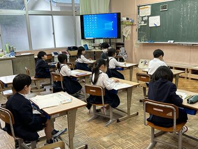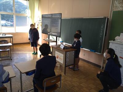 今日は、天草市教育委員会の先生、御所浦中学校の先生、東京からの学生さん(キャラバン隊)が来校されました。2時間目の5年生の国語の授業では、タブレット端末に自分の考えを残しながら、話し合いが行われました。児童は、緊張しながらも話し合いが少しずつ活発になっていく姿が見られました。緊張の中での授業、これも大切な経験です。