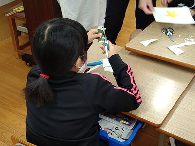 のびのび学級は、自立活動です。コミュニケーションとはさみの使い方を中心とした手先の細かな動きを考える学習です。ポイントを相談し合って、とても複雑な形も大丈夫です。