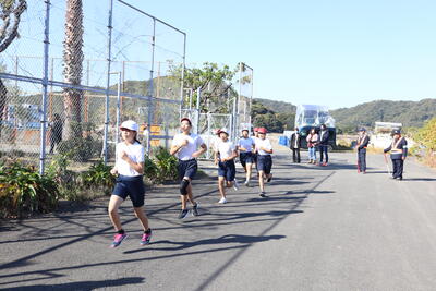 5、6年生。6年生のスタート前の円陣の様子です。小学校最後のマラソン大会。
