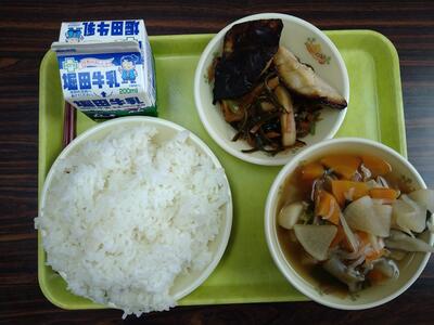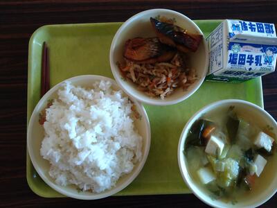 今日の給食です。サバの照り焼、切り干し大根の酢の物、みそ汁。美味しくいただきました。