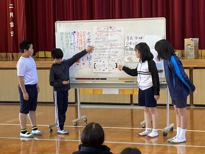 今日の児童集会では、体育委員会の発表と文化展の表彰が行われました。 体育委員会からは、各学年ごとの体力課題が提示され、それに応じたおすすめの運動が紹介されました。 限られた時間の中で練習を重ねた成果がよく伝わる、工夫された発表でした。 続いて、文化展の表彰がありました。毛筆や硬筆など、優秀賞に輝いた作品は全部で12点。 賞に選ばれなかった児童も、それぞれが心を込めて、自分だけのとっておきの作品を完成させていました。