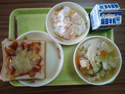 ピザトースト、ラビオリスープ、フルーツヨーグルト