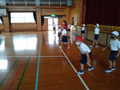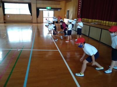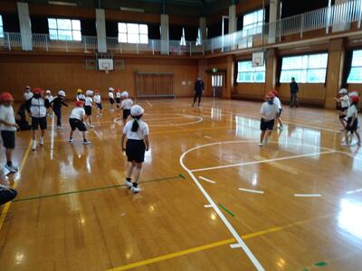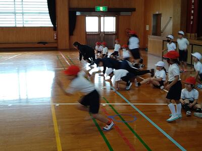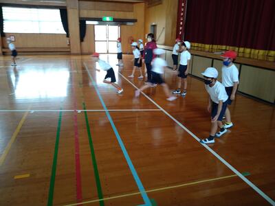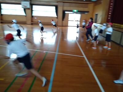 さて、2年生の体育、室内でのリレーです。躍動感ある走りです。