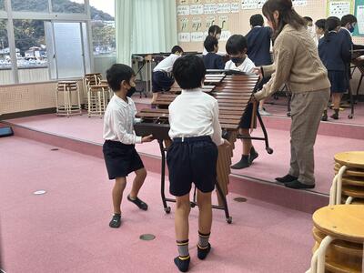 2年生。合奏の準備をしていました。みんなで「せーの!」と協力しながら準備しています。