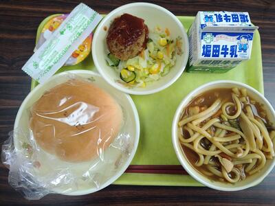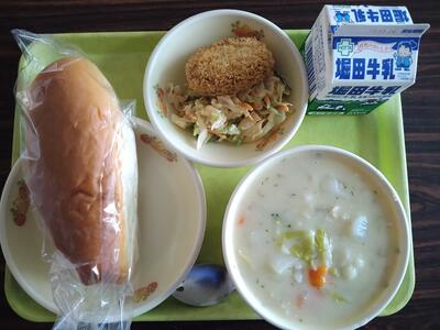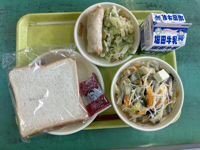 今日の給食「食パン、マーシャルチョコ、ミニはるまき、シーザーサラダ、カレー風味ビーフンスープ、牛乳」です。美味しくいただきました。