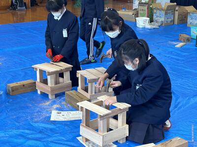次に、「木のよさ」を体感するために、天草産の間伐材を使って椅子づくりがはじまりました。