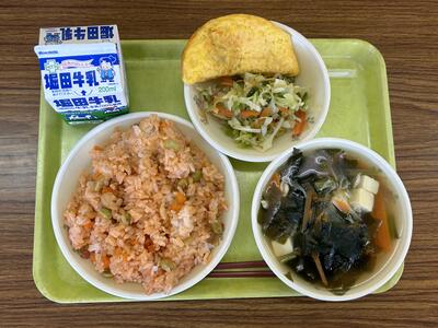 今日の給食は、「チキンライス、オムレツ、野菜サラダ、わかめスープ、牛乳」です。写真は、大盛り大人用です。