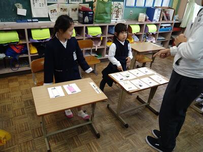 2年生は算数。図形の四角形、三角形、直角三角形の特徴を考えての図形の敷つめの学習です。
